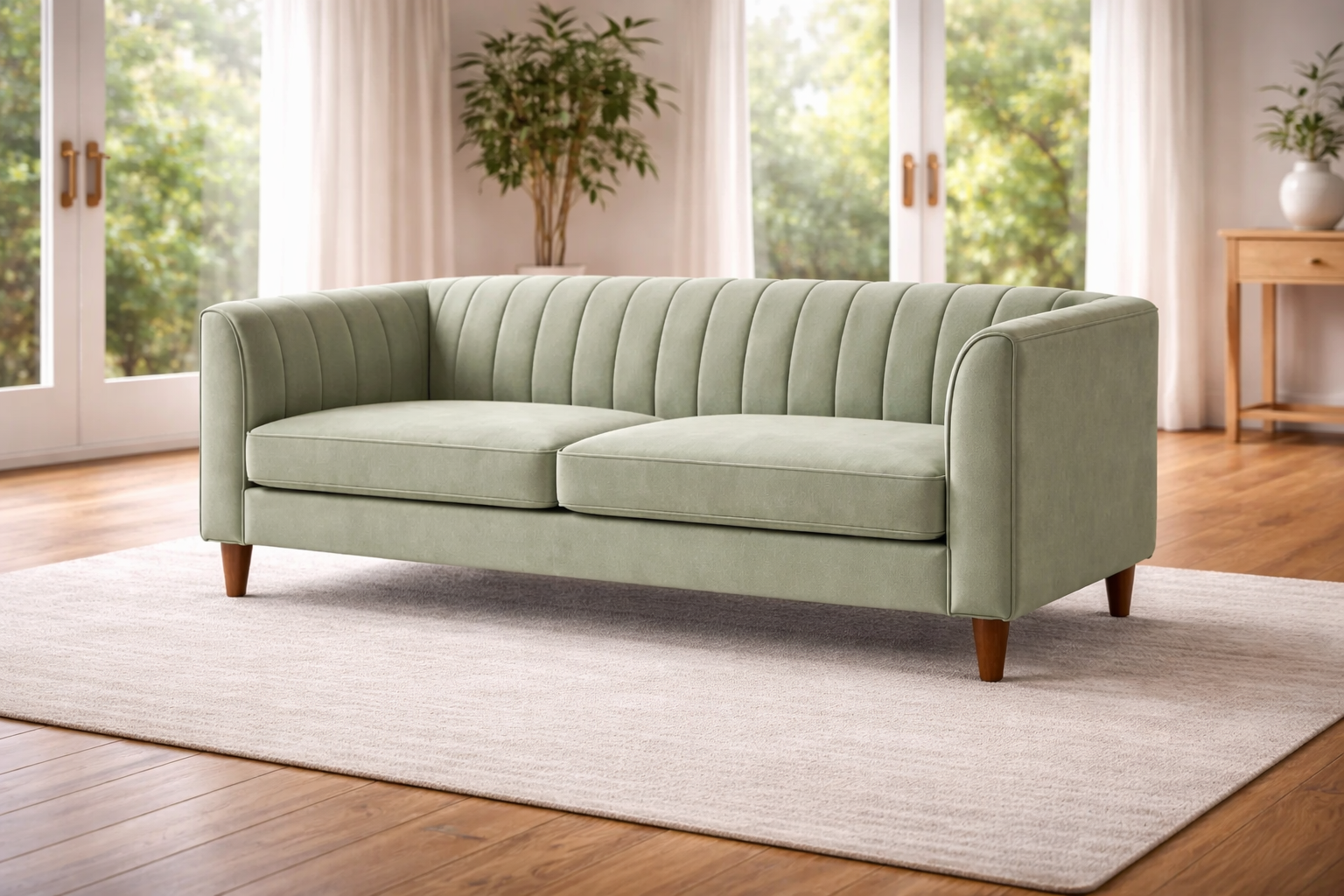 Canapé en velours vert clair avec pieds en bois