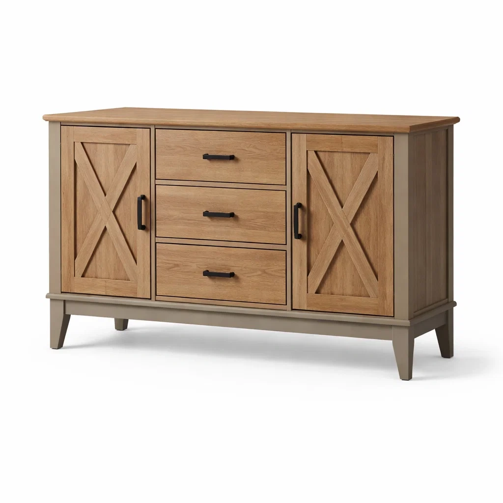 Buffet en bois chêne clair et écru avec tiroirs et portes
