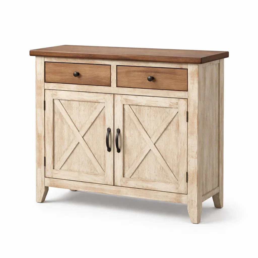 Buffet en bois chêne clair et écru avec tiroirs et portes